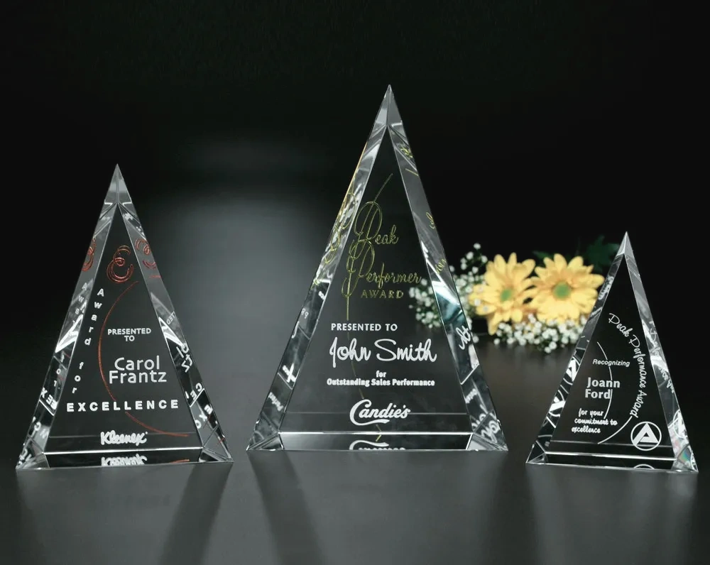 We offer a large selection of beautiful optical crystal accolades and obelisks, as well as a variety of plaques and other creative awards with custom etching. Contact us to get started on a free quote and layout.